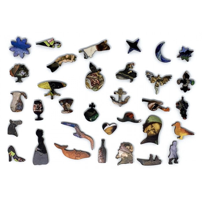 The perfect gift for wooden jigsaw puzzlers, this traditional adult wooden jigsaw puzzle can be done time and again. Our wooden jigsaw puzzle artists have included many shaped whimsy puzzle pieces that match the themes of the paintings, and we have integrated them in ways that will delight and surprise you as you put the puzzle together.