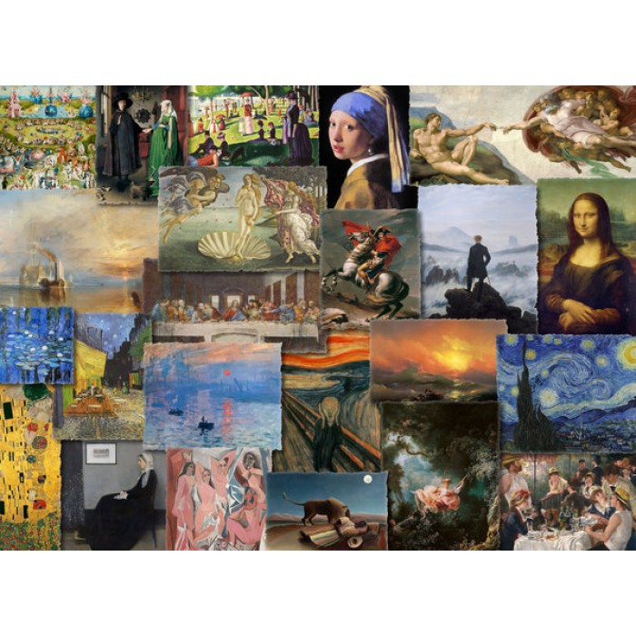 Featuring 23 of the most famous paintings in Art History, this beautiful puzzle includes shaped whimsy pieces that reflect the theme of each masterpiece.