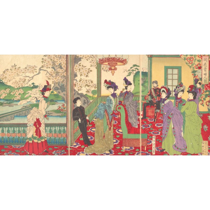 This triptych of woodblock prints shows the emperor, empress, prince, and ladies of the court enjoying the cherry blossoms at a Western-style building in Tokyo's Ueno Park. The women wear high fashion French-style dresses of the day, with high collars and bustles. First printed in 1887, this wooden jigsaw puzzle represents a turning point in woodblock subject matter from traditional Japanese scenes to those that reflect the new aesthetic of modernization and western influence.