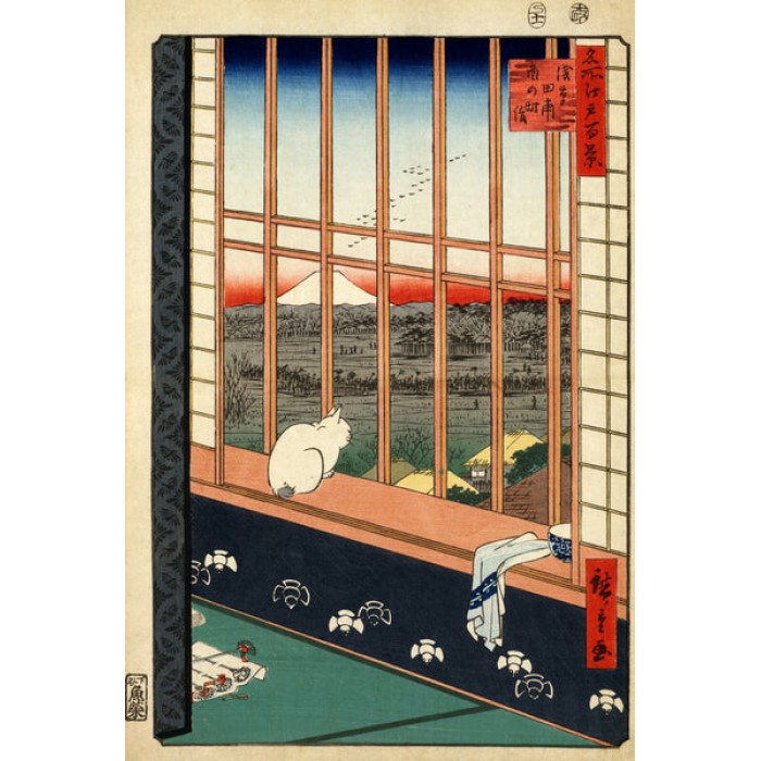 Asakusa Rice Fields and Torinamachi Festival is a beautiful Japanese woodblock by Utagawa (Ando) Hiroshige from the series " One Hundred Famous Views of Edo" and shows a cuddly white cat in a window looking out over the fields to Mt Fuji.
