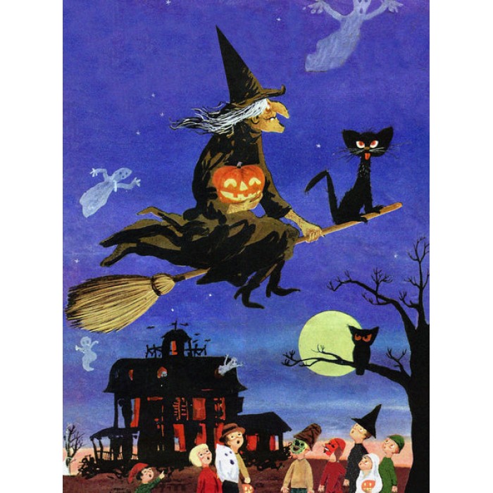 Here is our favorite Halloween witch taking her carved pumpkin and black kitty cat to the Halloween party, accompanied by the ghosties and ghoulies, and enthralling the trick or treaters watching her from below.