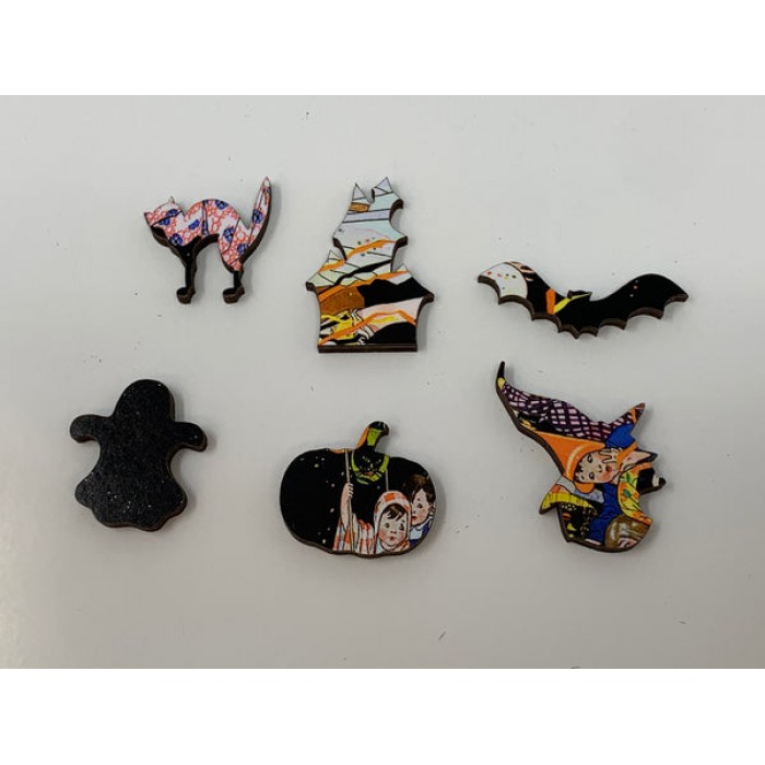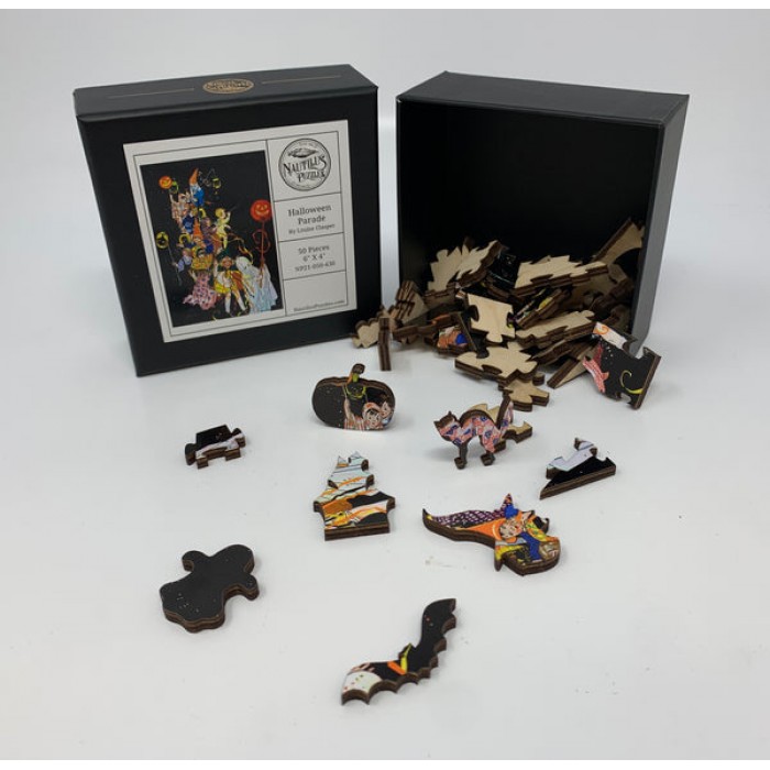 The perfect gift for mini wooden jigsaw puzzlers, fine art enthusiasts, and Halloween fans, this traditional adult mini wooden jigsaw puzzle can be done time and again. Our puzzle artists have included many shaped Halloween whimsy mini wooden puzzle pieces that match the theme of the painting, and we have integrated them in ways that will delight and surprise you as you put the mini wooden jigsaw puzzle together.