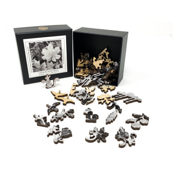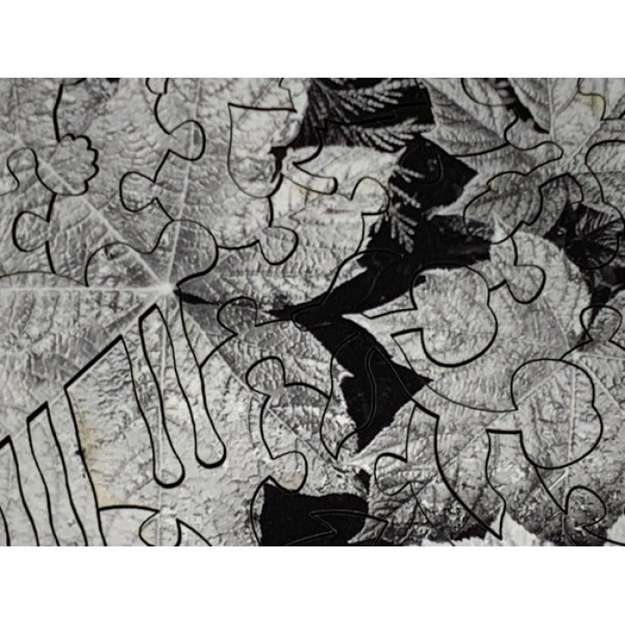 Beautiful black and white image of forest leaves. Featuring leaf and autumn-shaped whimsy puzzle pieces.