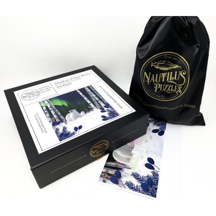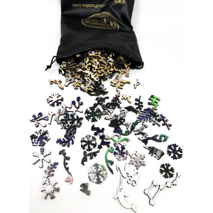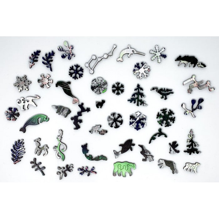 The perfect gift for wooden jigsaw puzzlers and fans of the Northern Lights, this traditional adult wooden jigsaw puzzle can be done time and again. Our wooden jigsaw puzzle artists have included many Alaska-themed-shaped whimsy puzzle pieces that match the subject of the image, and we have integrated them in ways that will delight and surprise you as you put the wooden jigsaw puzzle together.