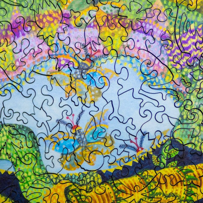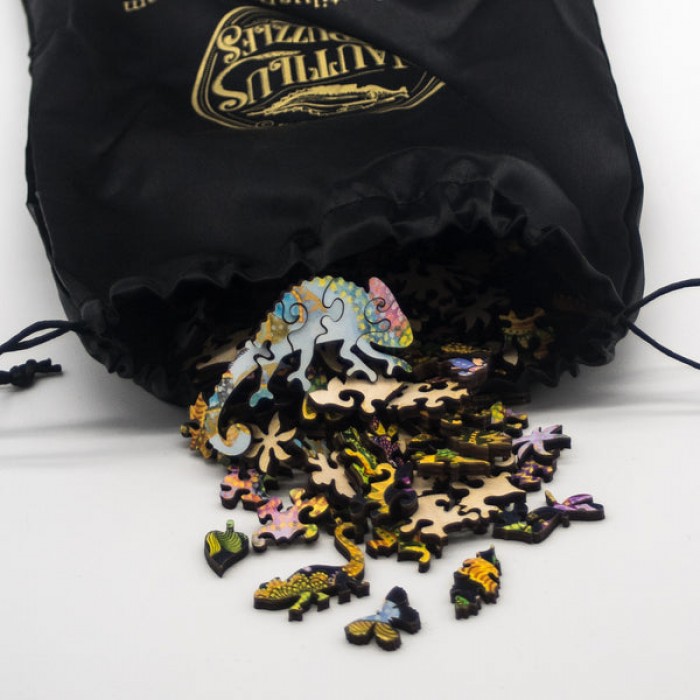 The perfect gift for wooden jigsaw puzzlers and desert and lizard fans, this wooden jigsaw puzzle can be done time and again. Our wooden jigsaw puzzle artists have included many flower and butterfly shaped whimsy wooden jigsaw puzzle pieces that match the theme of the image, and we have integrated them in ways that will delight and surprise you as you put the wooden jigsaw puzzle together.