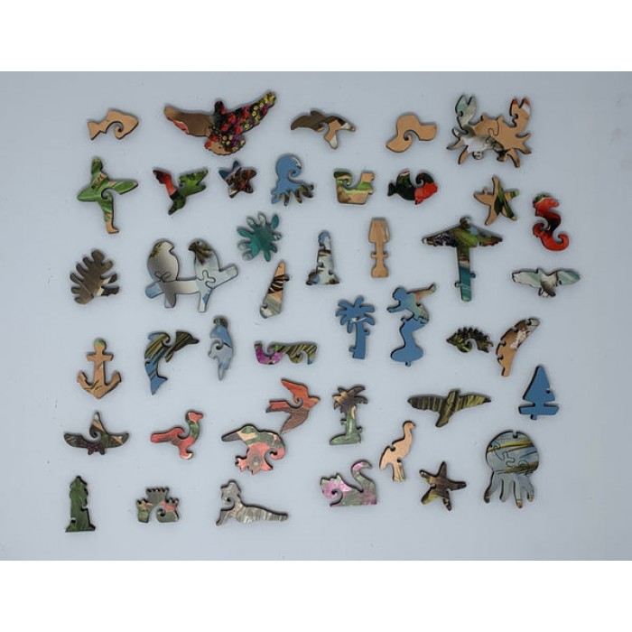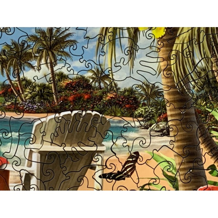 The perfect gift for wooden jigsaw puzzlers, tropical island and sailing fans, this traditional adult wooden jigsaw puzzle can be done time and again. Our wooden jigsaw puzzle artists have included many shaped whimsy puzzle pieces that match the subject of the painting, and we have integrated them in ways that will delight and surprise you as you put the wooden jigsaw puzzle together.