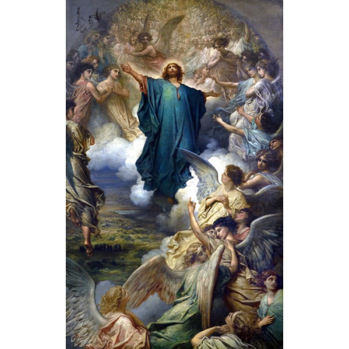 Painted in 1879, at the height of his career, Doré depicts Christ in glory but still human, with wide-open arms, surrounded by a multitude of angels.R..
