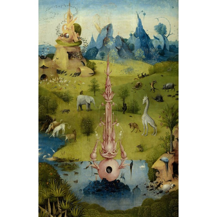 This detail from the famous triptych known as The Garden of Earthly Delights by Hieronymus Bosch is from the upper portion of the left panel and features the animals (both real and fanciful) God populated Eden with before Adam and Eve were banished from the garden.