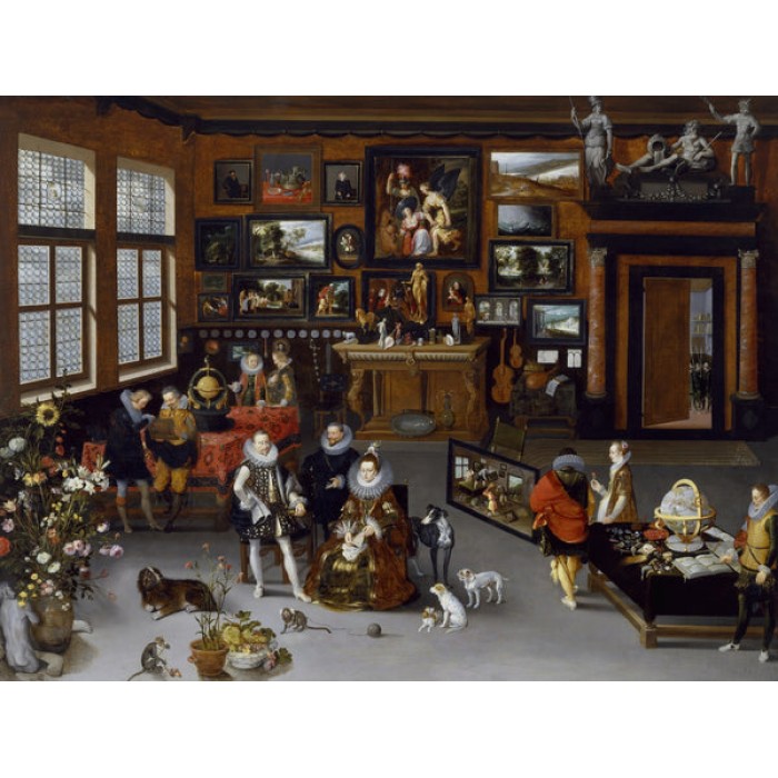 The Archdukes Albert and Isabella Visiting a Collector's Cabinet depicts a visit by the Hapsburg rulers of the Spanish Netherlands to a 17th-century Flemish collector's cabinet (a precursor to the modern museum). In addition to a collection of exotic animals, plants, and antiques, the walls are covered with paintings by Flemish artists and there are also numerous sculptures including the bronze statue, Allegory of Architecture by Giambologna.