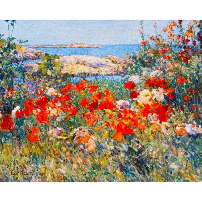 Childe Hassam was a regular visitor to the Isles of Shoals, nine small, rocky, treeless islands off the New Hampshire coast. The painting portrays the stunning wildflower garden cultivated by his friend, poet Celia Thaxter, a garden that provided a marvelous contrast to the rugged terrain of the islands in the background. Vibrant red poppies entangled in lush green foliage introduce a view of bleached Babb's Rock. It is considered one of Hassam's finest works and currently hangs in the National Gallery in Washington DC.