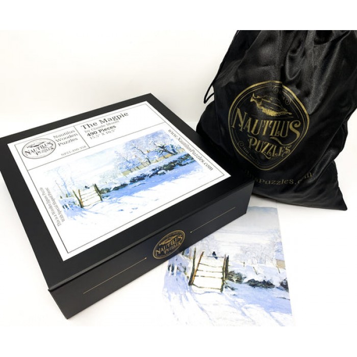 The perfect gift for wooden jigsaw puzzlers, Impressionist fans, and lovers of Claude Monet's Painting, this traditional adult wooden jigsaw puzzle can be done time and again. Our wooden jigsaw puzzle artists have included many winter and Impressionism-themed shaped whimsy wooden jigsaw puzzle pieces that match the subject of the painting, and we have integrated them in ways that will delight and surprise you as you put the wooden jigsaw puzzle together.