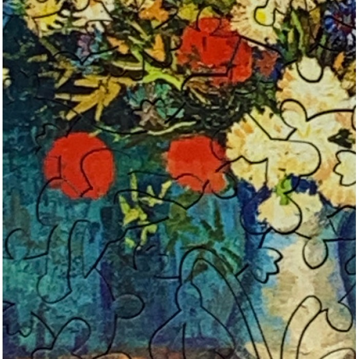 Sunflowers were his favorite to paint, he liked how they were not elegant and classy, and that they were more rustic and sturdy plants. He went on to paint 11 still lifes of sunflowers. In this mini wooden jigsaw puzzle, he has painted a vase full of beautiful flowers, but surprisingly not any sunflowers.