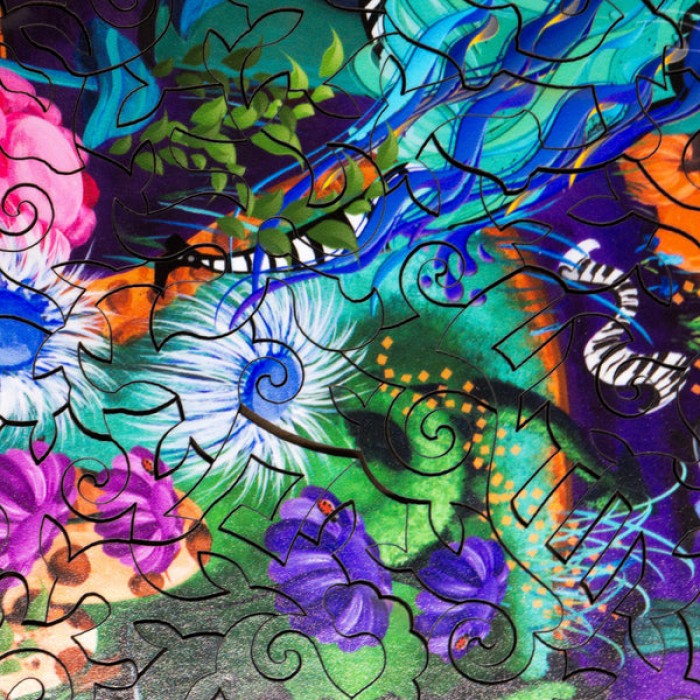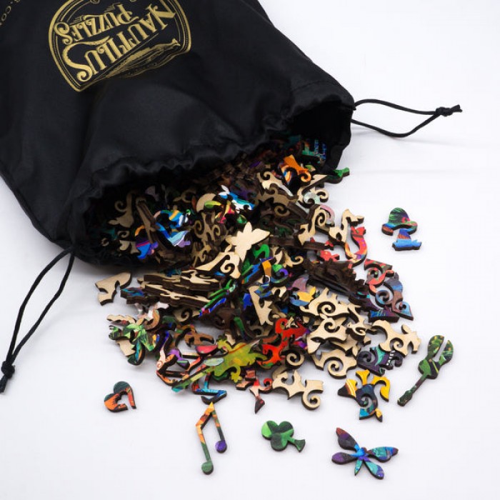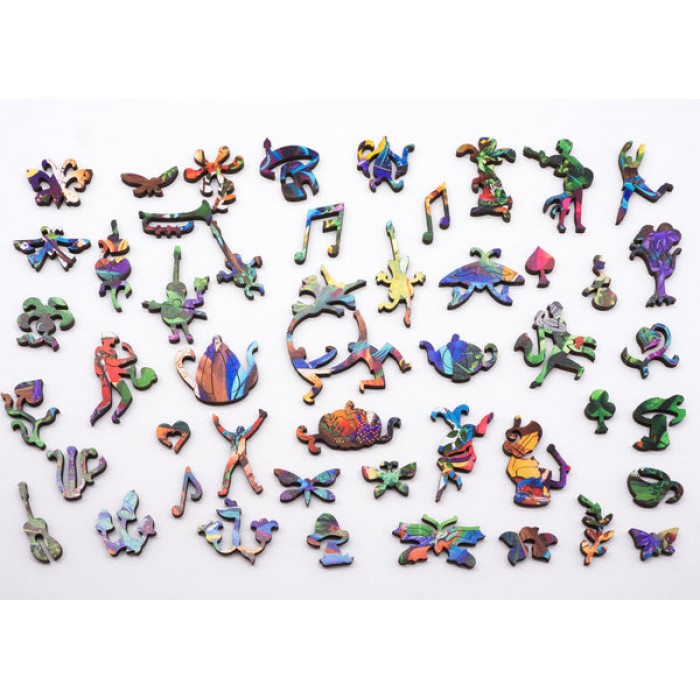 This traditional adult wooden jigsaw puzzle can be done time and again and is the perfect gift for wooden jigsaw puzzlers, music lovers, and Alice In Wonderland fans. Our puzzle artists have included many Wonderland-themed, whimsy wooden jigsaw puzzle pieces that match the subject of the artwork. We have integrated them in ways that will delight and surprise you as you put the wooden jigsaw puzzle together.