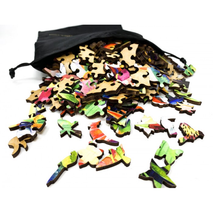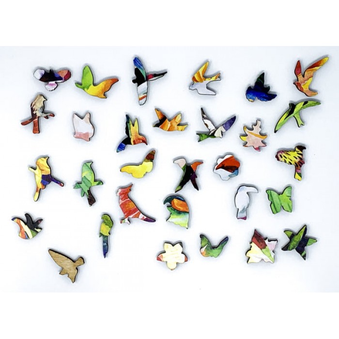 The perfect gift for wooden jigsaw puzzlers and bird lovers, this traditional adult wooden jigsaw puzzle can be done time and again. Our puzzle artists have included many bird-themed shaped whimsy puzzle pieces that match the subject of the image, and we have integrated them in ways that will delight and surprise you as you put the wooden jigsaw puzzle together.