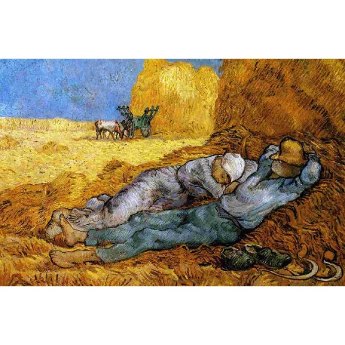The Siesta was painted while Van Gogh was resident in a mental asylum in Saint-Rémy de Provence. The composition is taken from a drawing by Jean-Francois Millet for his series Four Moments in the Day.
