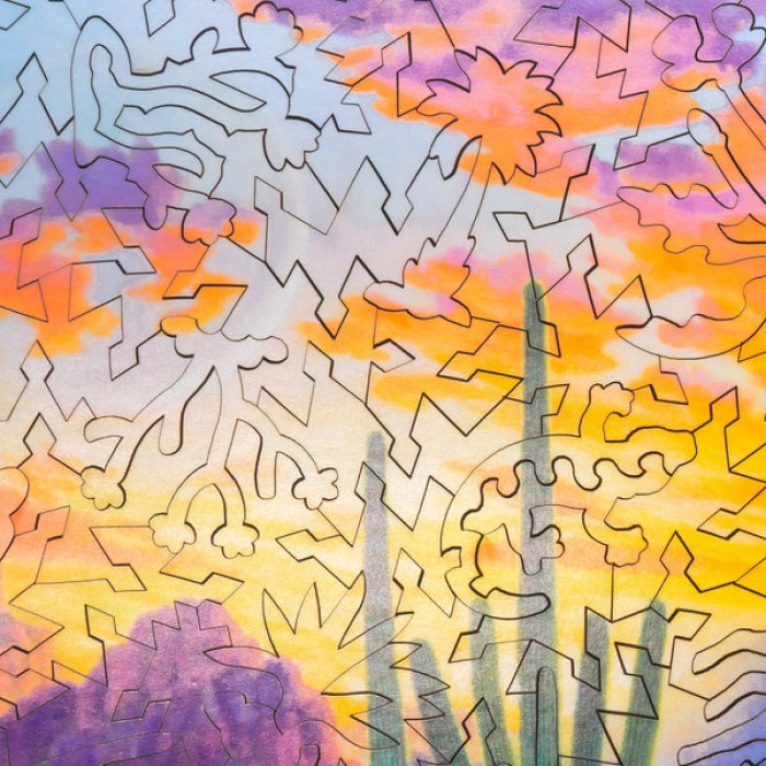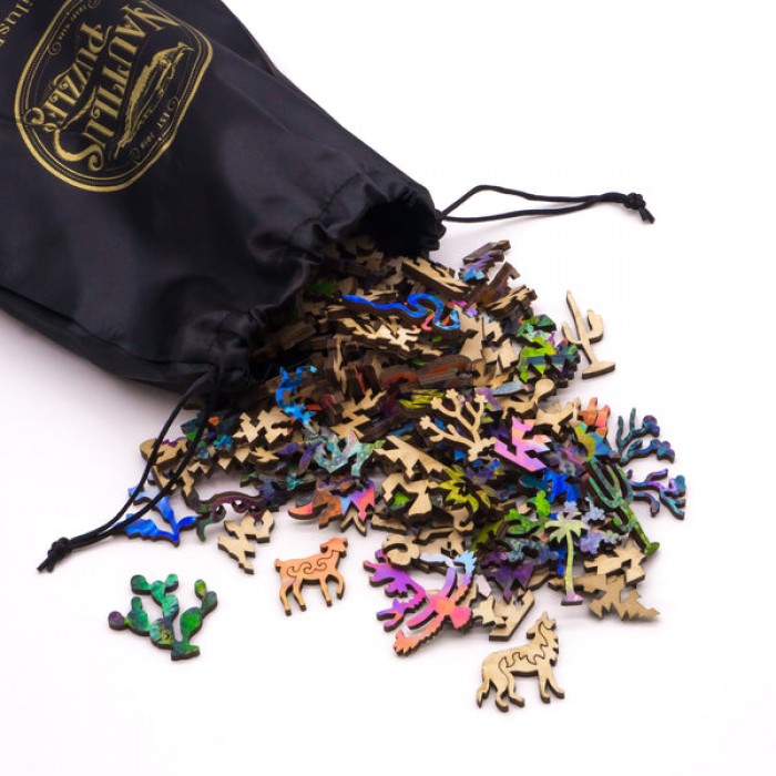 The perfect gift for wooden jigsaw puzzlers and desert fans, this traditional adult wooden jigsaw puzzle can be done time and again. Our wooden jigsaw puzzle artists have included many shaped whimsy wooden jigsaw puzzle pieces that match the theme of the image, and we have integrated them in ways that will delight and surprise you as you put the wooden jigsaw puzzle together.