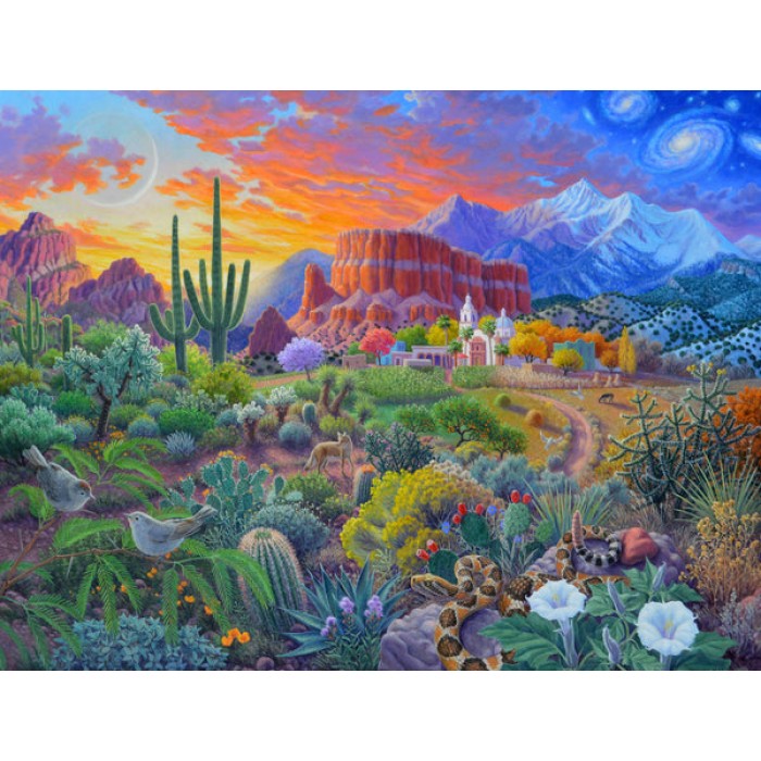 This superb painting combines several southwest themes into one surreal, colorful and compelling picture.