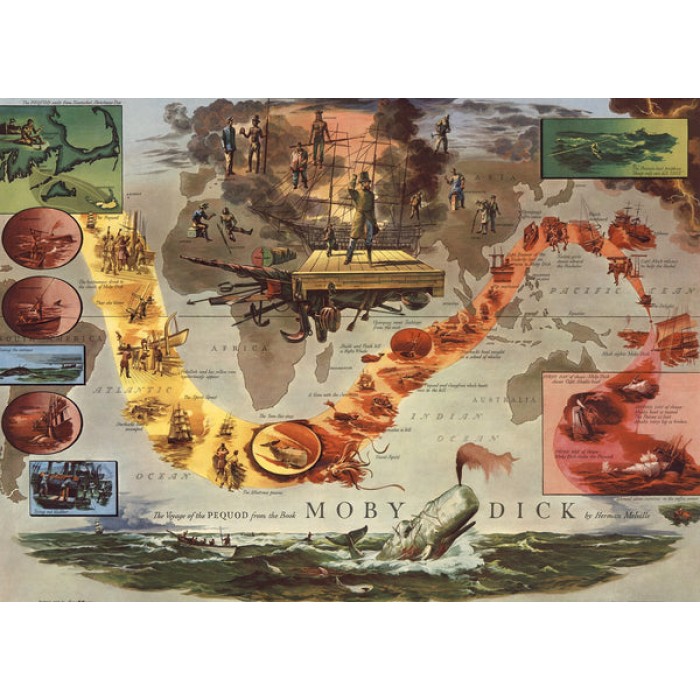 This meticulously detailed illustrated map traces the events in Herman Melville's classic novel Moby Dick. Whimsy shaped pieces depict the people, places, creatures, vessels, and nautical artifacts that populate this epic tale.