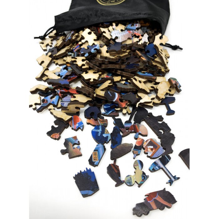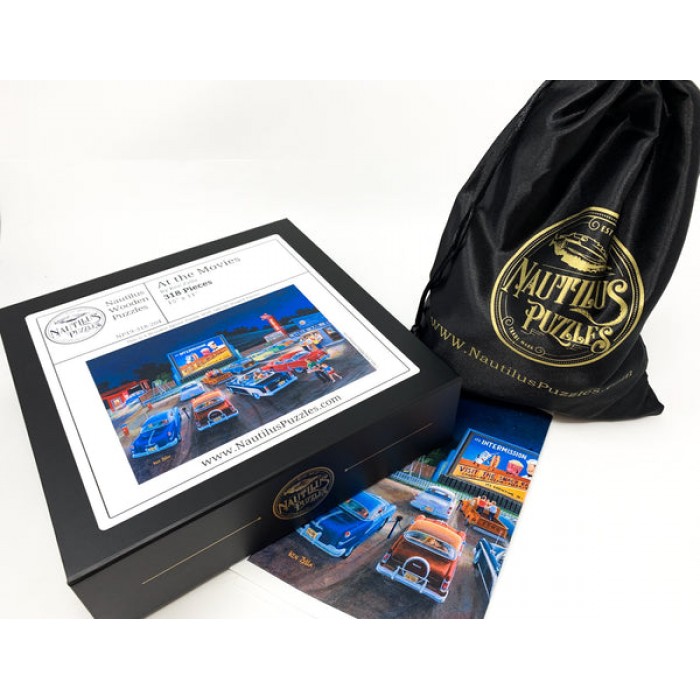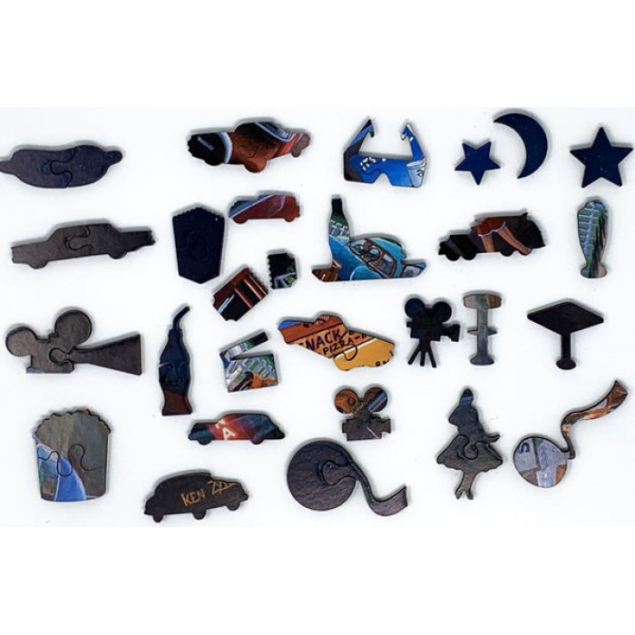 The perfect gift for wooden jigsaw puzzlers and movie fanatics, this traditional adult wooden jigsaw puzzle can be done time and again. Our puzzle artists have included many film-shaped whimsy puzzle pieces that match the subject of the painting, and we have integrated them in ways that will delight and surprise you as you put the wooden jigsaw puzzle together.