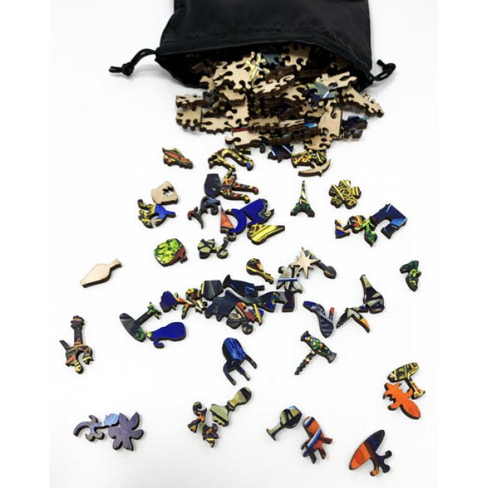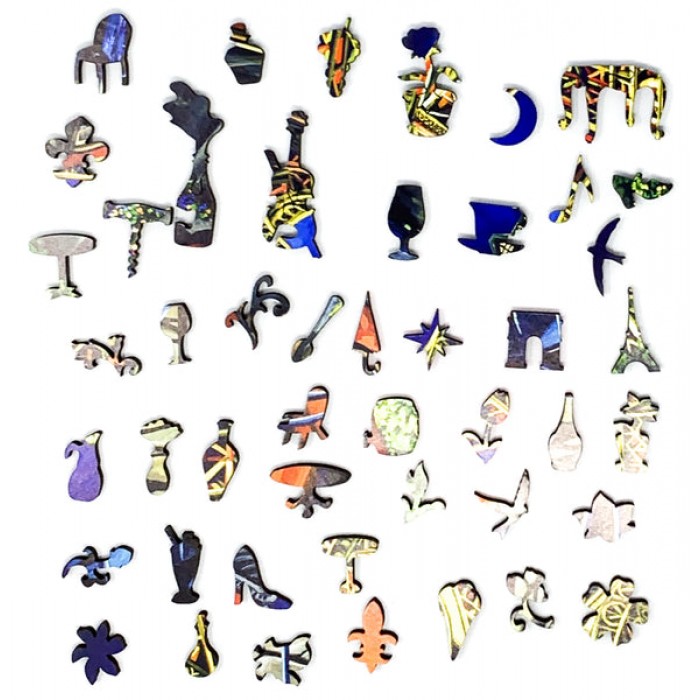 The perfect gift for wooden jigsaw puzzlers and Paris lovers, this traditional adult wooden jigsaw puzzle can be done time and again. Our wooden jigsaw puzzle artists have included many shaped whimsy puzzle pieces that match the subject of the painting, and we have integrated them in ways that will delight and surprise you as you put the wooden jigsaw puzzle together.