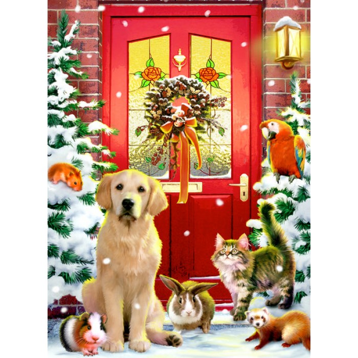 This adorable Christmas wooden jigsaw puzzle includes all of our favorite furry friends awaiting you at the door. They are hoping to come inside for a bowl of warm milk and love.