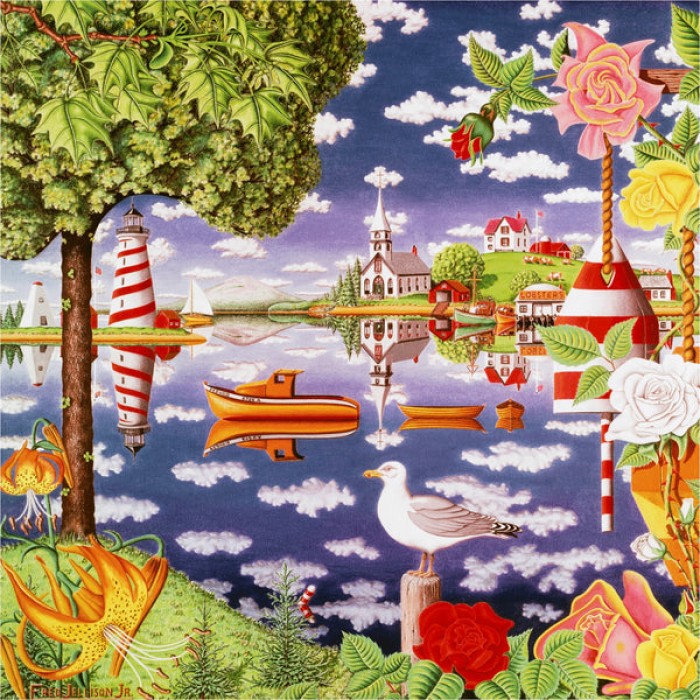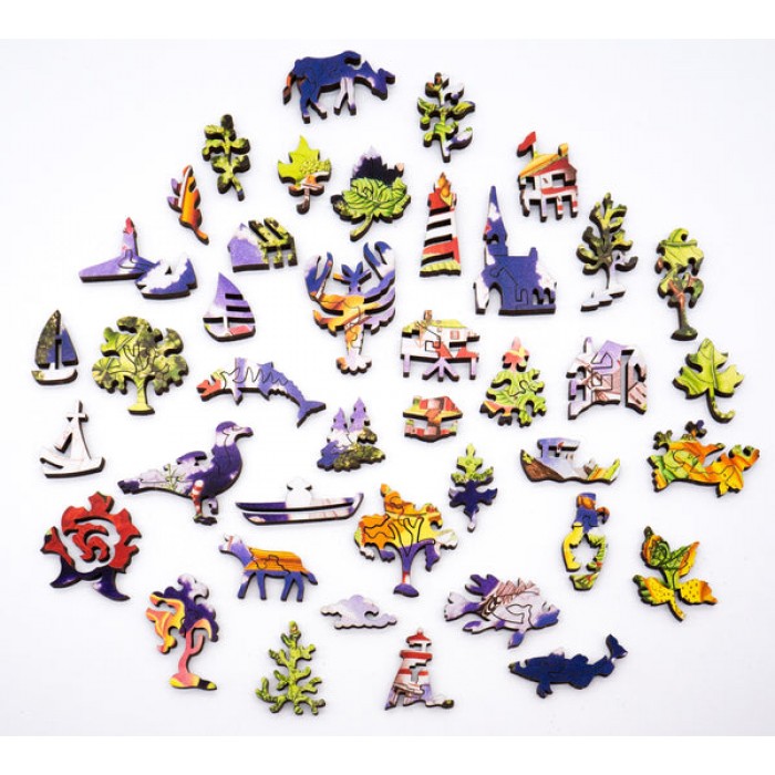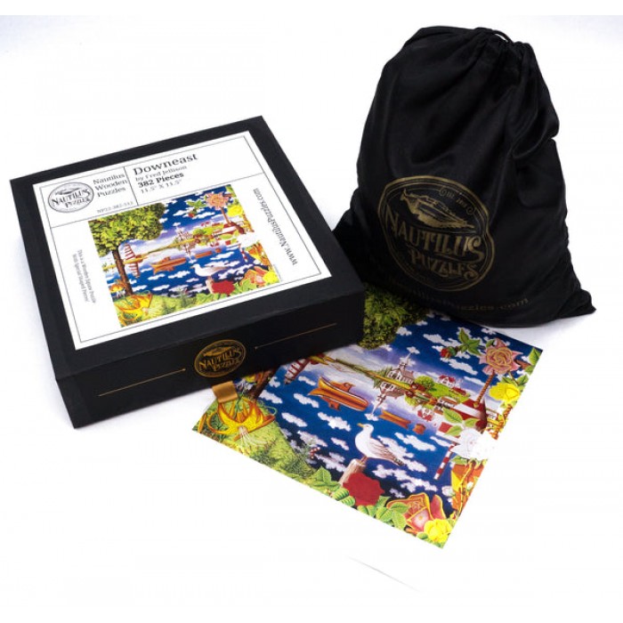 The perfect gift for wooden jigsaw puzzlers, Maine, Northeast and lighthouse fans, this traditional adult wooden jigsaw puzzle can be done time and again. Our wooden jigsaw puzzle artists have included many shaped whimsy wooden jigsaw puzzle pieces that match the subject of the painting, and we have integrated them in ways that will delight and surprise you as you put the wooden jigsaw puzzle together.