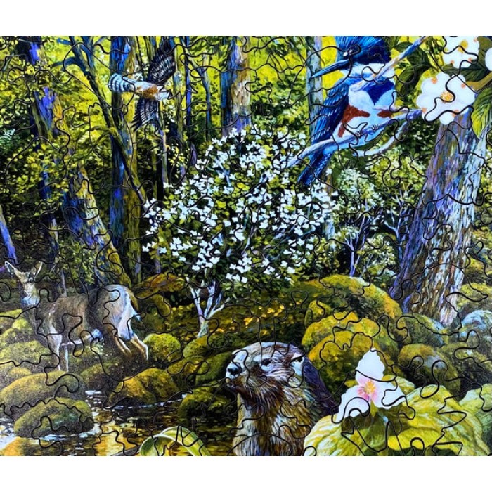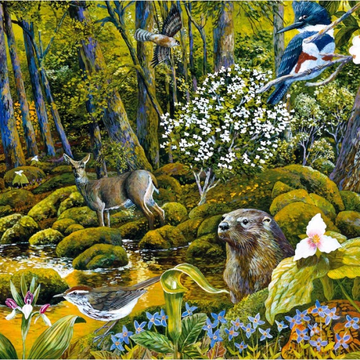 Eifert grew up going to the Great Smoky Mountains with his parents often. This forest had always been a great fascination to him and is still struck by the beauty of flame azaleas. In his painting, we see various forest animals, birds, squirrels, and even a bobcat lurking through the leaves.