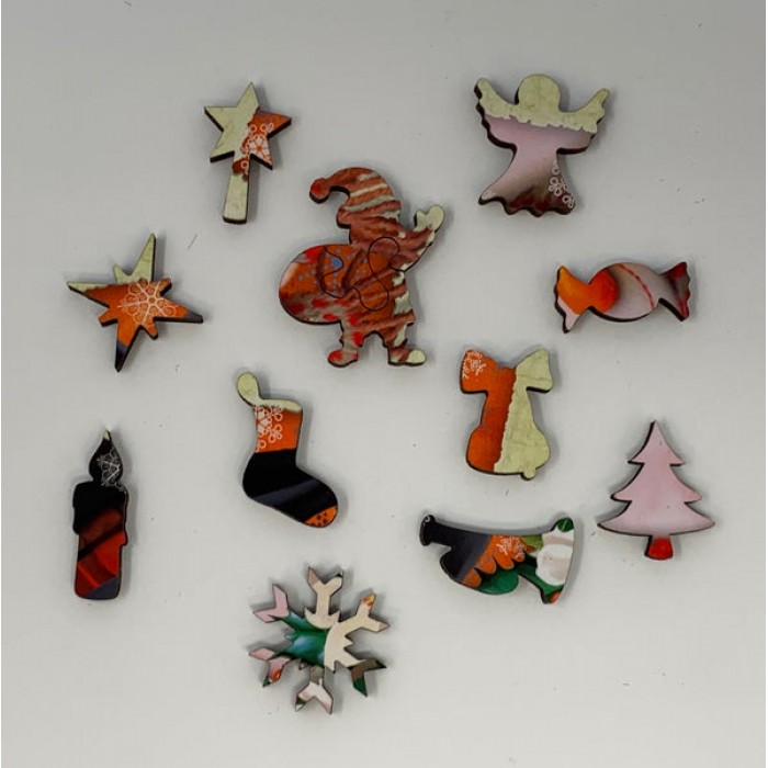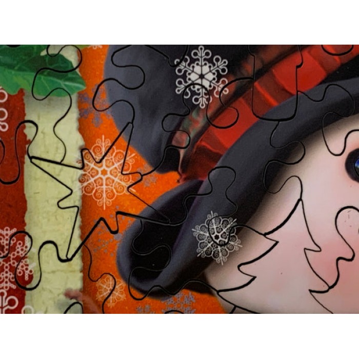 The perfect gift or stocking-stuffer for any jigsaw puzzler, this mini wooden jigsaw puzzle can be done time and again. Our puzzle artists have included many Christmas-inspired shaped whimsy puzzle pieces that match the theme of the painting, and we have integrated them in ways that will delight and surprise you as you put the mini wooden jigsaw puzzle together.