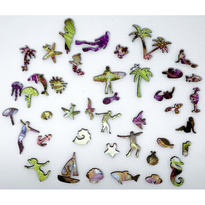 The perfect gift for wooden jigsaw puzzlers, ocean and marine life fans, this traditional adult wooden jigsaw puzzle can be done time and again. Our puzzle artists have included many beach and ocean shaped whimsy puzzle pieces that match the subject of the image, and we have integrated them in ways that will delight and surprise you as you put the wooden jigsaw puzzle together.