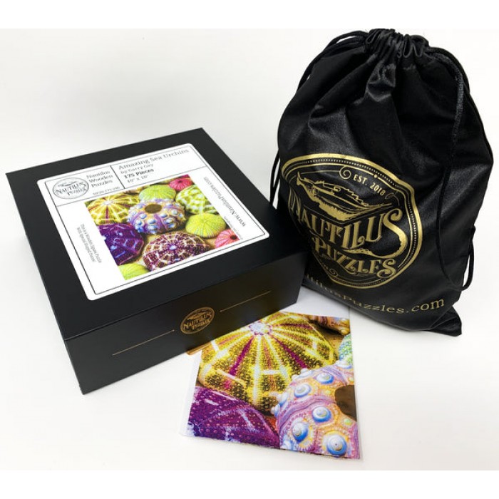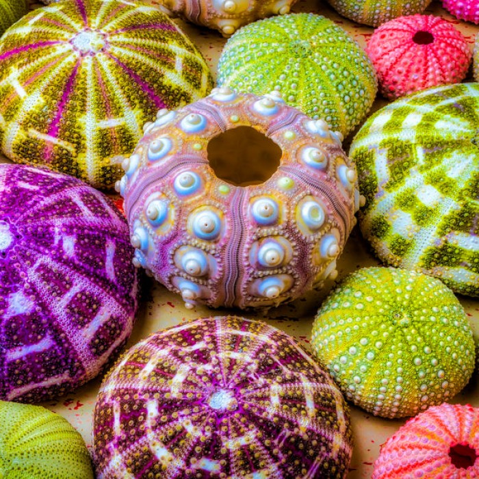 This is a beautiful photograph of sea urchins displayed in all their glory. Isn't it incredible that these gorgeous colors exist in the ocean? This image on our wooden jigsaw puzzle has not been enhanced in any way. These amazing hues just occur naturally, leaving us breathless at the wonders created by Mother Nature. Garry Gay has created this lovely collage for your puzzling enjoyment.