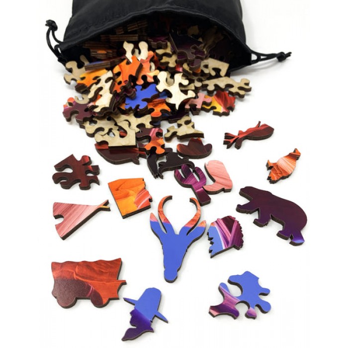 The perfect gift for wooden jigsaw puzzlers, National Park enthusiasts, and Desert Puzzle fans, this traditional adult wooden jigsaw puzzle can be done time and again. Our wooden jigsaw puzzle artists have included many Southwestern-themed whimsy puzzle pieces that match the subject of the image, and we have integrated them in ways that will delight and surprise you as you put the wooden jigsaw puzzle together.
