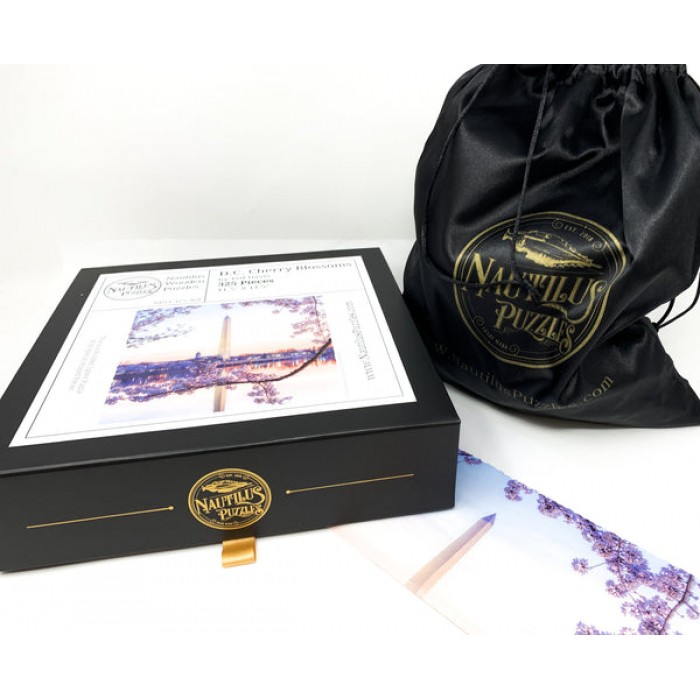 The perfect gift for wooden jigsaw puzzlers, Washington DC and Cherry Blossom fans, this traditional adult wooden jigsaw puzzle can be done time and again. Our puzzle artists have included many Springtime themed whimsy wooden jigsaw puzzle pieces that match the subject of the photograph, and we have integrated them in ways that will delight and surprise you as you put the wooden jigsaw puzzle together.