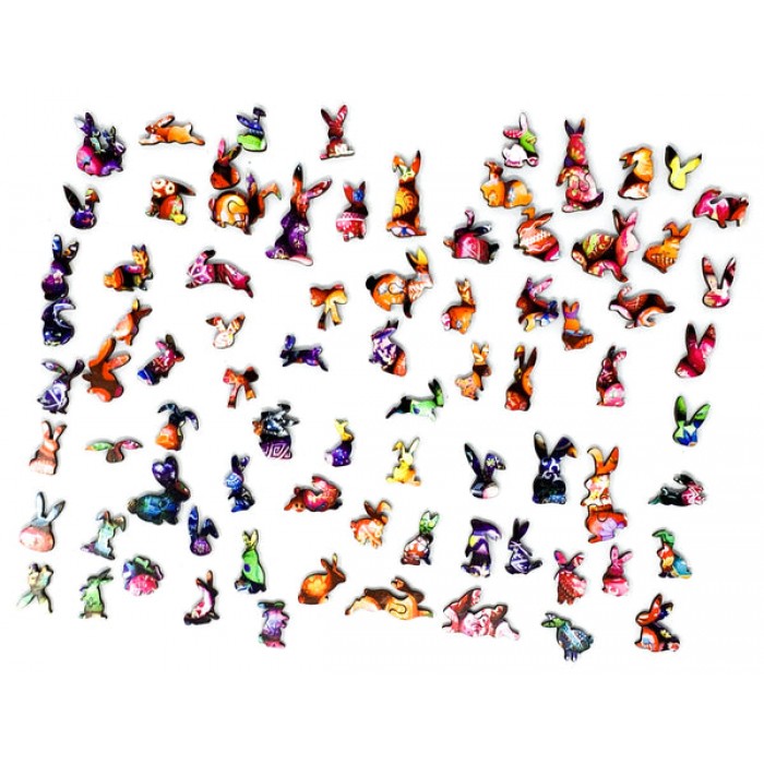Rather than filling this Easter wooden jigsaw puzzle full of whimsies in the shape of eggs (BORING!), our designer has chosen to fill it full of frolicking Easter Bunnies, hippety-hopping their way towards Easter.