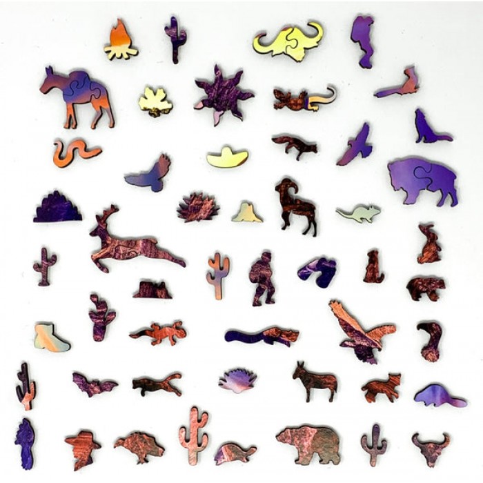 The perfect gift for wooden jigsaw puzzlers, National Park enthusiasts, and Desert Puzzle fans, this traditional adult wooden jigsaw puzzle can be done time and again. Our puzzle artists have included many Southwestern-themed whimsy wooden jigsaw puzzle pieces that match the subject of the image, and we have integrated them in ways that will delight and surprise you as you put the wooden jigsaw puzzle together.