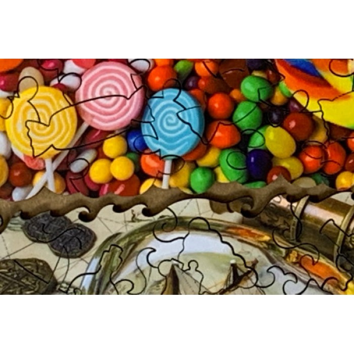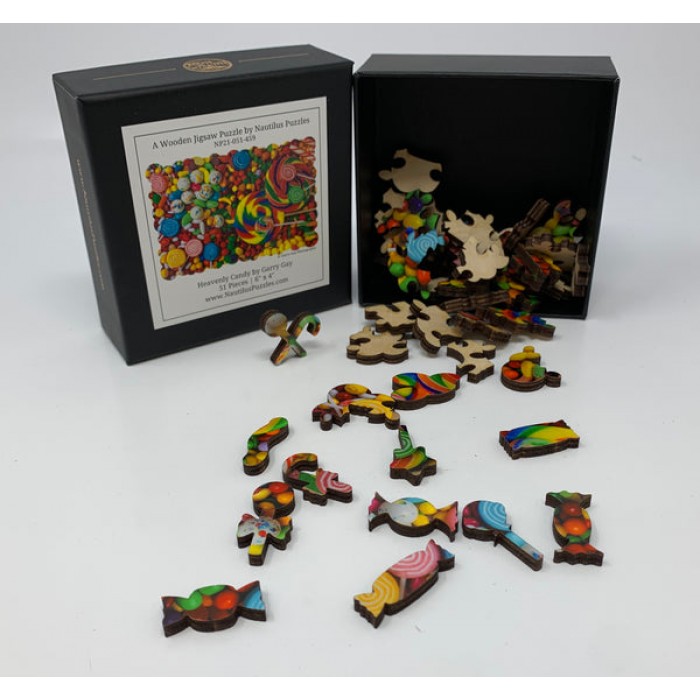 The perfect gift for mini wooden puzzlers, photo puzzle enthusiasts, and candy and lollipop fans, this traditional adult mini wooden puzzle can be done time and again. Our puzzle artists have included many candy shaped whimsy puzzle pieces that match the theme of the image, and we have integrated them in ways that will delight and surprise you as you put the wooden candy puzzle together.