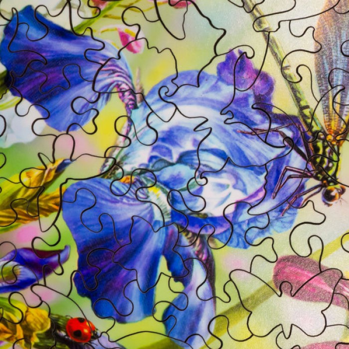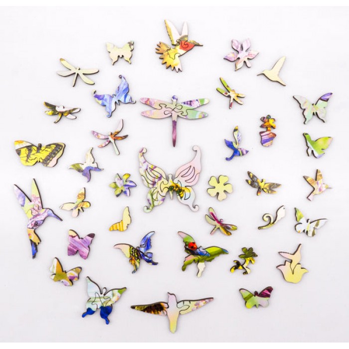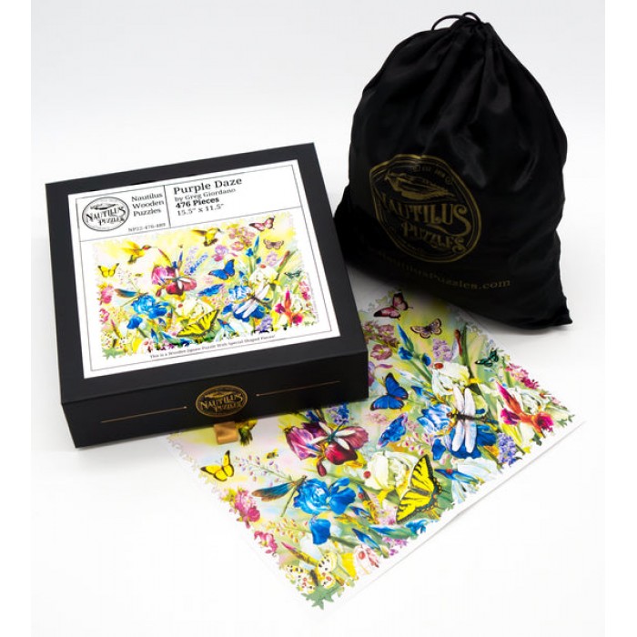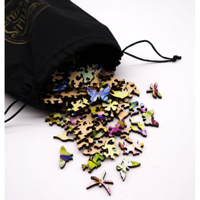 The perfect gift for wooden jigsaw puzzlers, and flower and butterfly fans, this wooden jigsaw puzzle can be done time and again. Our wooden jigsaw puzzle artists have included many shaped whimsy wooden jigsaw puzzle pieces that match the subject of the painting, and we have integrated them in ways that will delight and surprise you as you put the wooden jigsaw puzzle together.