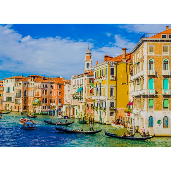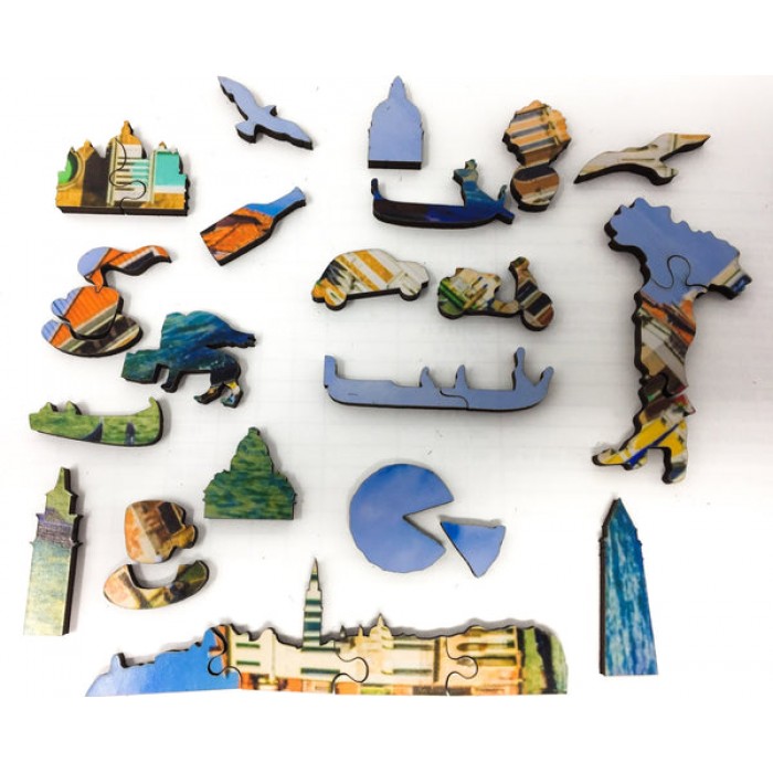 The perfect gift for wooden jigsaw puzzlers and lovers of Italy's romantic city of canals, this traditional adult wooden jigsaw puzzle can be done time and again. Our wooden jigsaw puzzle artists have included many shaped whimsy puzzle pieces that match the theme of the image, and we have integrated them in ways that will delight and surprise you as you put the puzzle together.