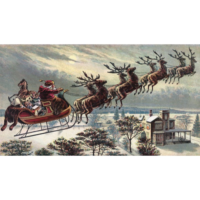 Celebrate the season with this classic scene of Santa leading his reindeer through the late Christmas sky, stopping by every house to bring smiles all around. This Christmas puzzle is a staple for any holiday collection and household.