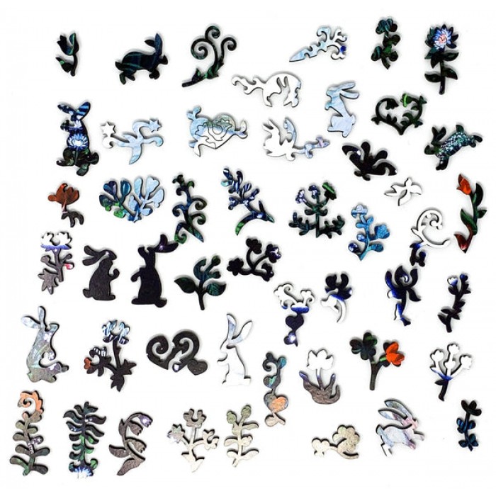 The perfect gift for wooden jigsaw puzzlers, Easter and Valentine's Day, and anniversaries, this traditional adult wooden jigsaw puzzle can be done time and again. Our puzzle artists have included many rabbit themed shaped whimsy puzzle pieces that match the subject of the image, and we have integrated them in ways that will delight and surprise you as you put the wooden jigsaw puzzle together.
