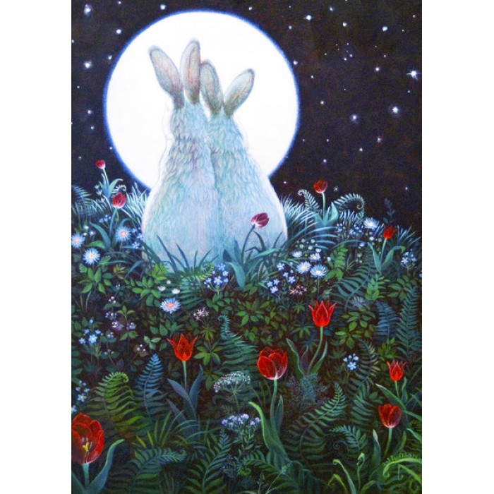 Love is in the air.These cute, cuddly, bunnies are enjoying the moonlight night, as they gaze at the moon in a field of wildflowers.The perfect gift f..