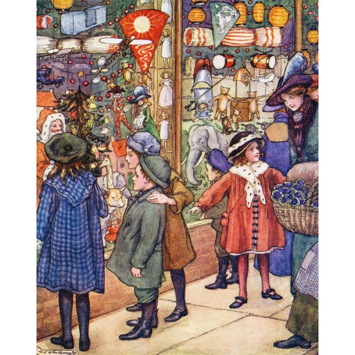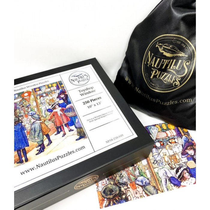 This wooden Christmas jigsaw puzzle shows a crowd of cute little Victorian children gathered around the toyshop window, enjoying the window design and all the toys in the window and picking out what they want from Santa.