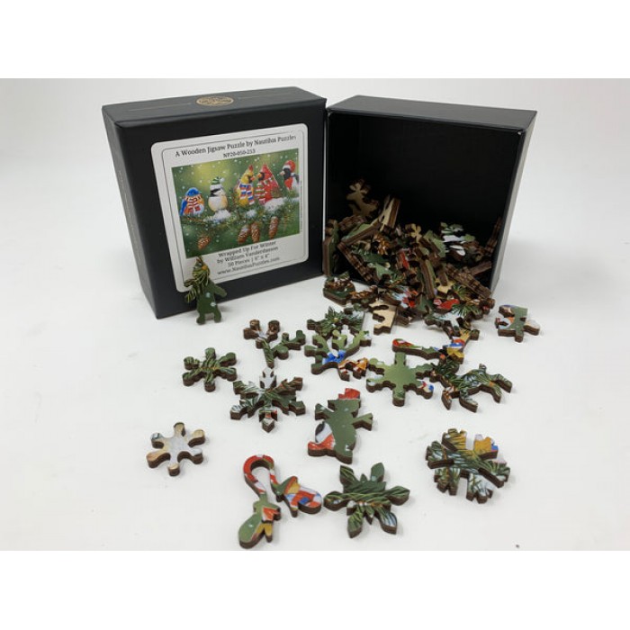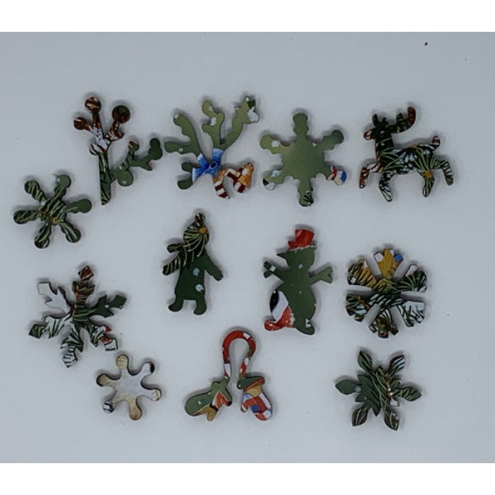 The perfect gift or stocking-stuffer for any jigsaw puzzler, this traditional mini winter wooden jigsaw puzzle can be done time and again. Our mini winter wooden jigsaw puzzle artists have included many Winter-inspired shaped whimsy puzzle pieces that match the theme of the painting, and we have integrated them in ways that will delight and surprise you as you put the mini winter wooden jigsaw puzzle together.